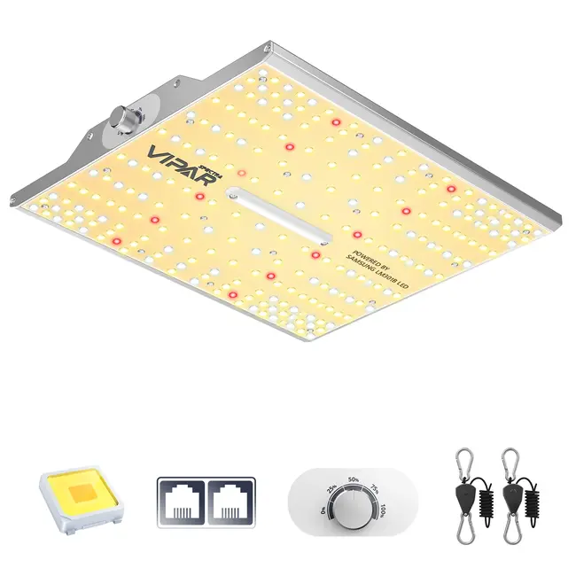 De XS1000 kweeklamp is de ideale keuze voor binnenkwekers die inzetten op hoogwaardige en energiezuinige verlichting. Onze lamp maakt gebruik van de nieuwste Samsung LM301B LEDs en biedt een optimaal volledig spectrum voor alle groeifasen van uw planten. Met de Daisy Chain-functie kunt u tot 20 lampen met elkaar verbinden, waardoor ze geschikt zijn voor zowel commerciële als hobbykwekers.